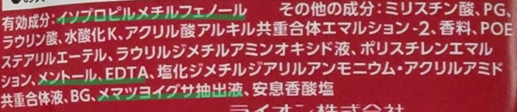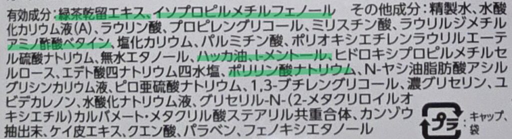 有効成分にイソプロピルメチルフェノールがしっかり入っています。添加濃度がわからないので、効果の程度が具体的にはいえませんが、この辺は企業秘密なんでしょうね。